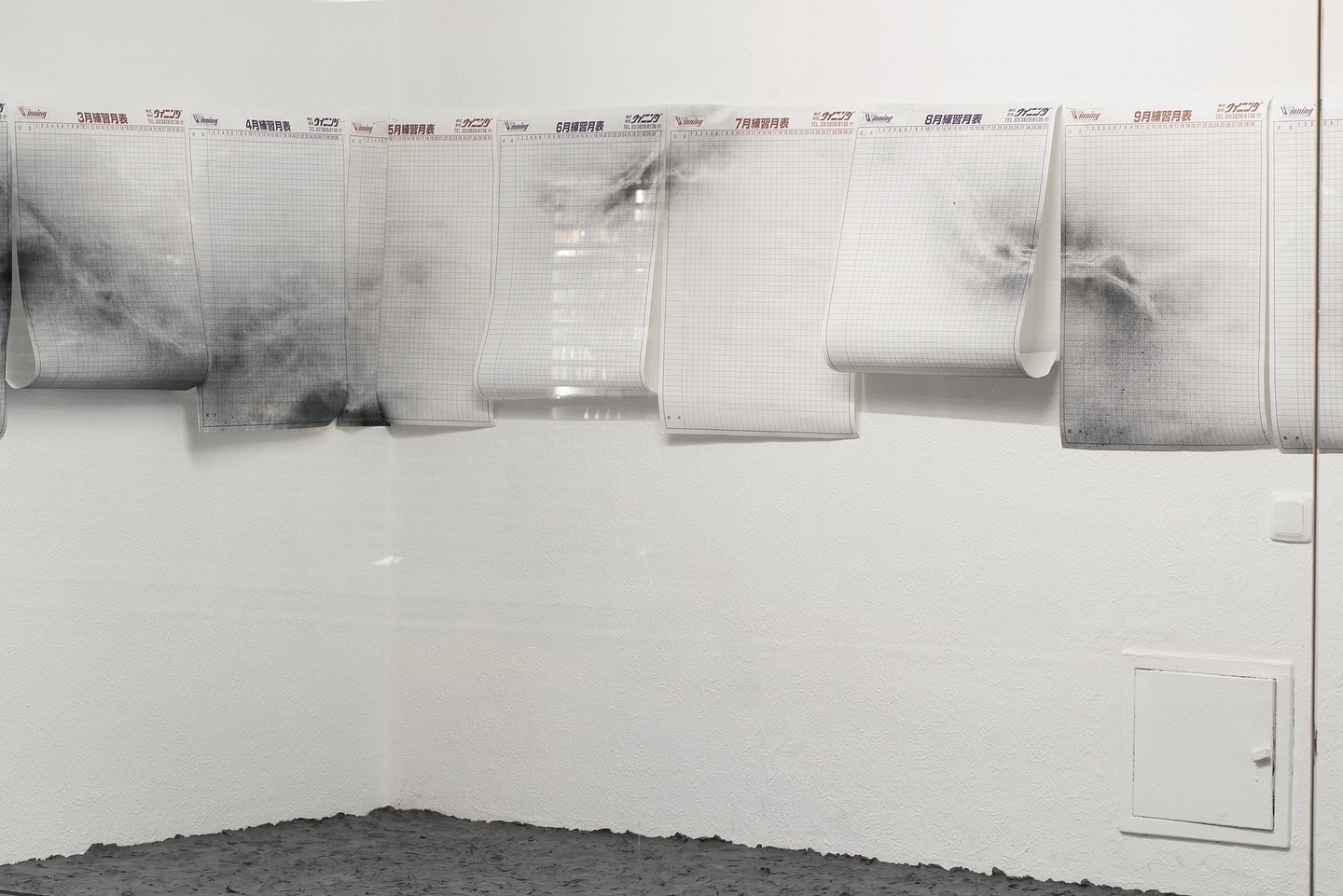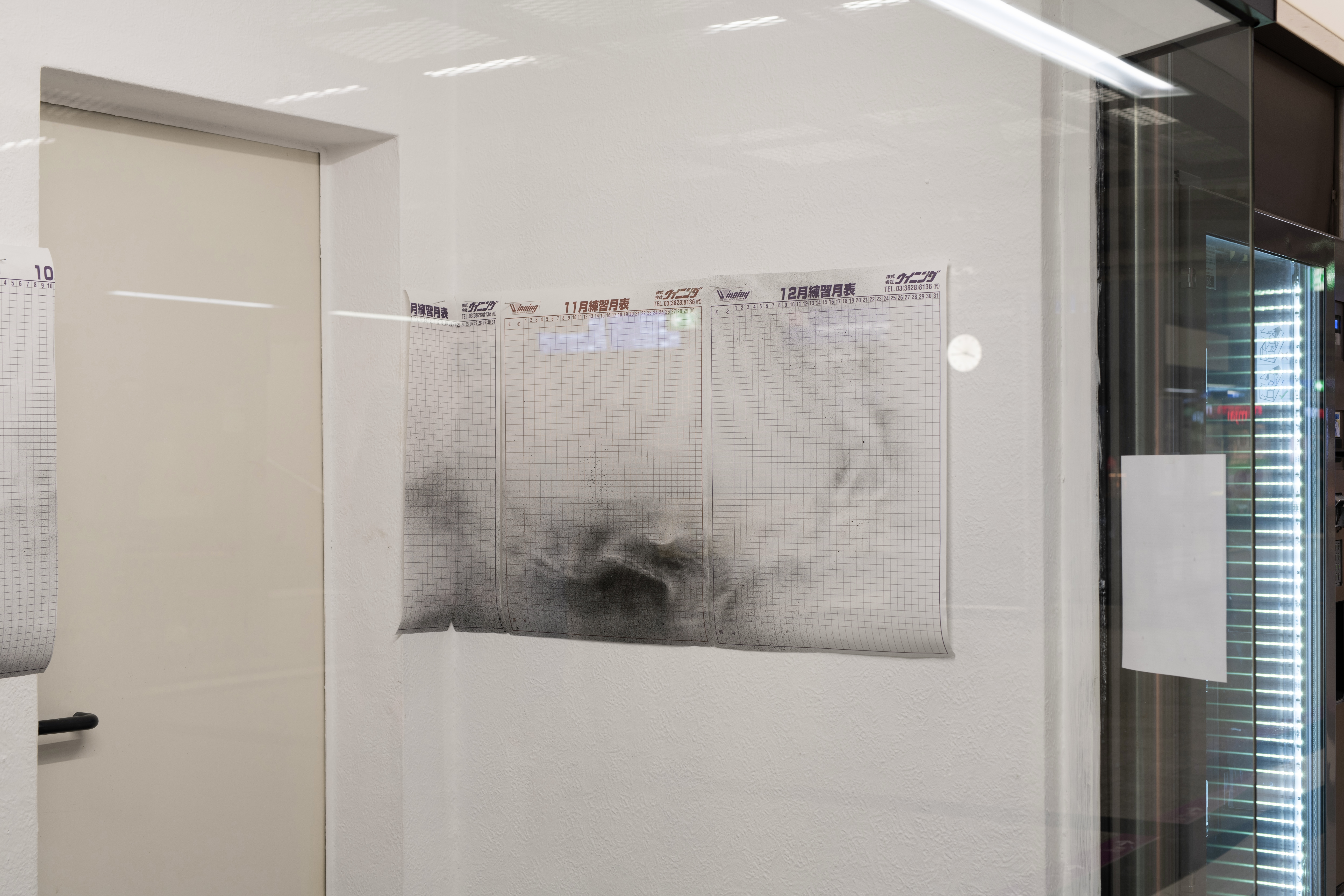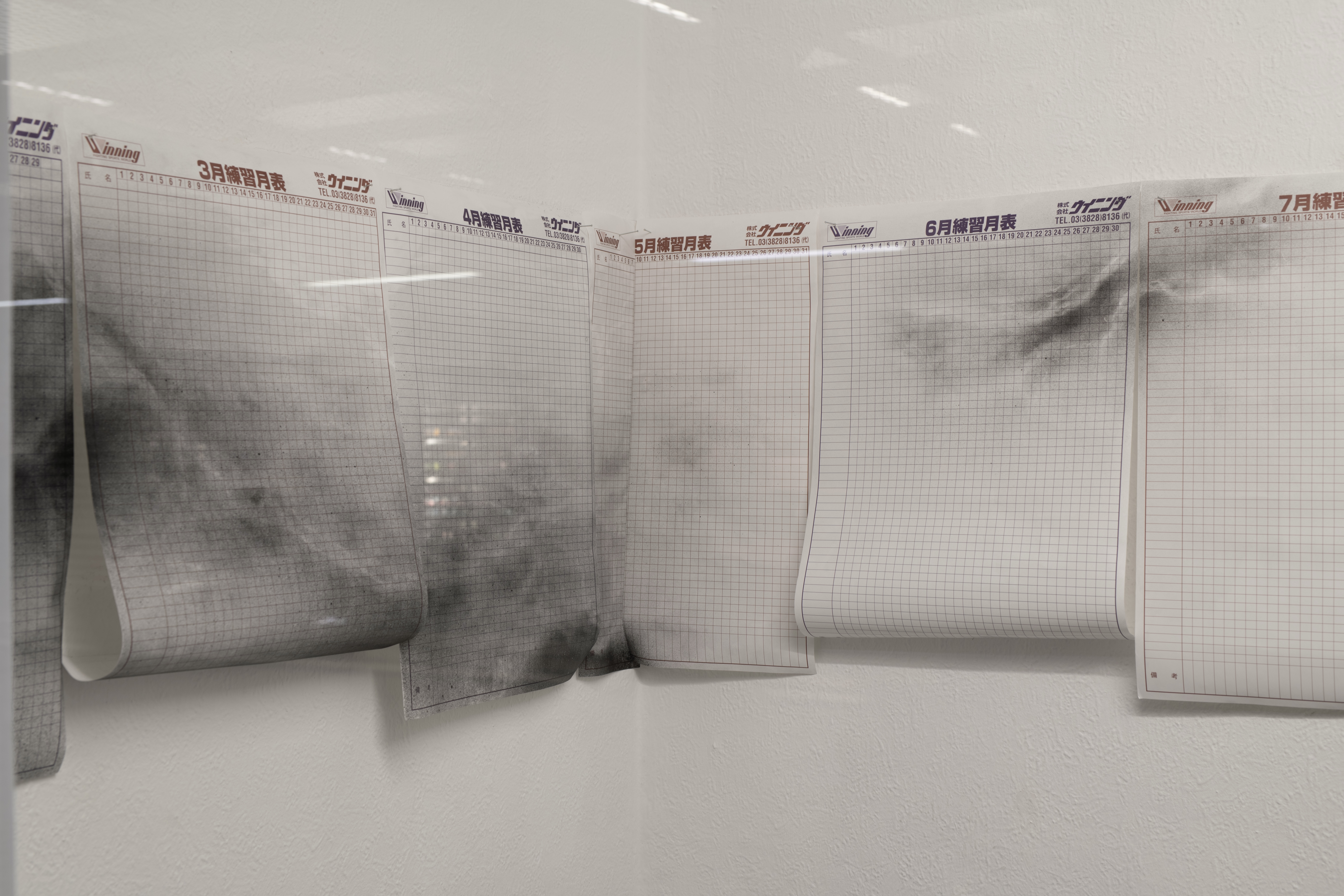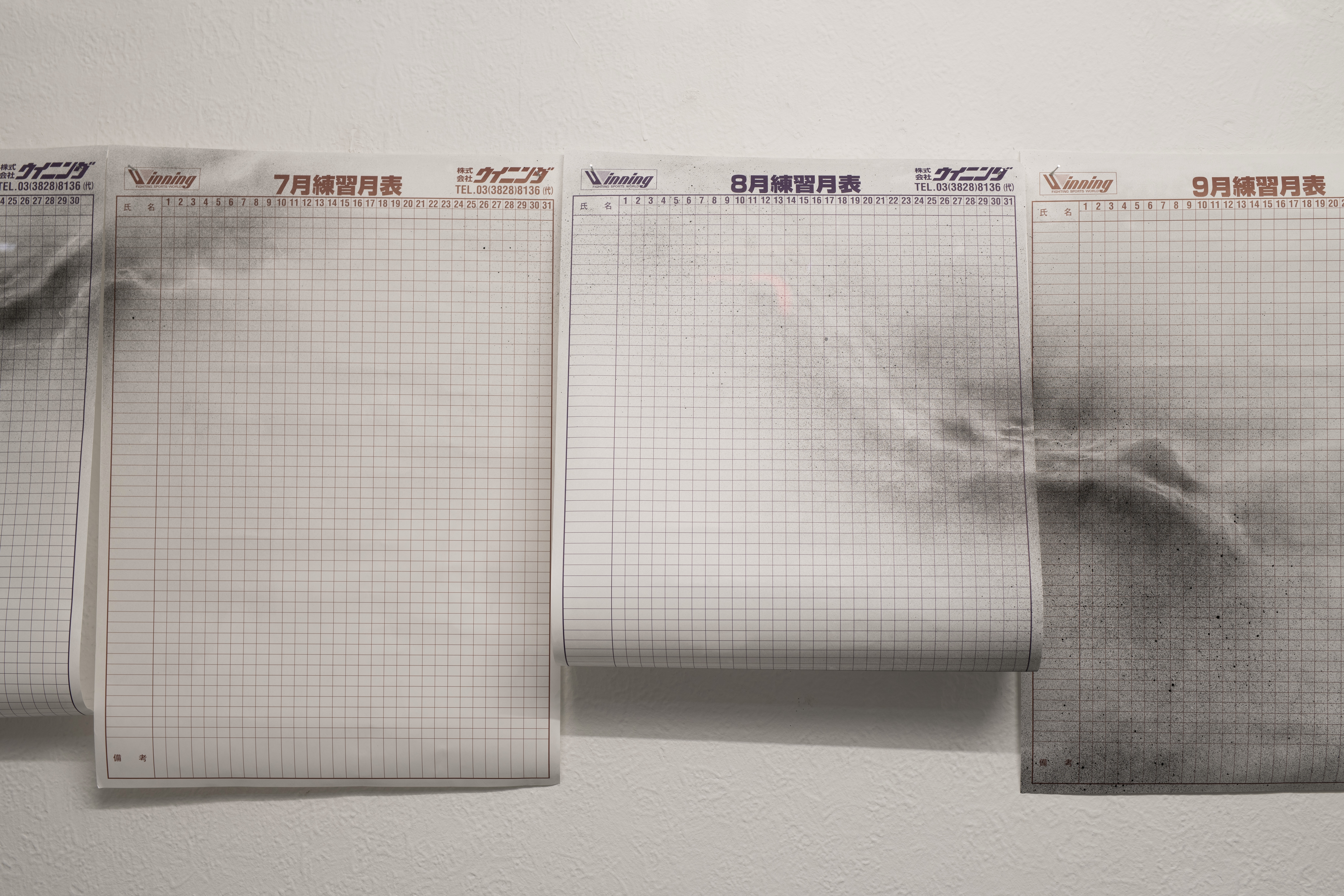 The twelve training calendar sheets of the Japanese boxing brand Winning structure time as a cyclical system. Divided into uniform units, they systemize discipline, repetition, and control. Time is presented as a neutral, measurable resource: calculable, continuous, and ostensibly distributed equally. Overlaying this normative grid are network-like structures that interrupt and destabilize its logic. These structures condense, overlap, fragment, or dissolve, disrupting the calendar’s claim to coherence. The calendrical model of time asserts structure, while time as lived experience remains uneven and variable.